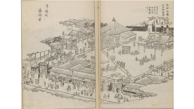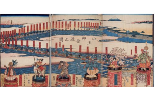 江戸で最大規模の祭礼と言われたのが山王祭で、江戸時代後期になると160余の氏子町を持ち、その地域は麴町や元飯田町と言った江戸城の西側に位置する武家地に囲まれたエリアと、日本橋、京橋といった大店の商家が立ち並ぶ商業エリアでした。山王祭がこのような大規模な祭礼となったのが寛永11年(1634)からで、延宝9年(1681)から神田祭と隔年交代となり、以後、子、寅、辰、午、申、戌の年の6月15日に執り行われることになります。