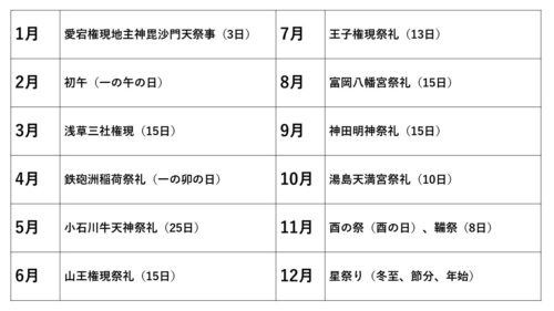 上図は主な江戸のお祭りの一覧です。一年を通して様々な祭礼が各所で執り行われていましたが、特に6月の「山王権現祭礼(山王祭)」と9月の「神田明神祭礼(神田祭)」は「天下祭」と呼ばれ、大変な賑わいを見せていました。これに「三社祭」、もしくは「八幡祭(富岡八幡宮)」を入れて、「江戸三大祭」と称されていました。「天下祭」の山王祭と神田祭は隔年で行われ、その伝統は現在も続いています。