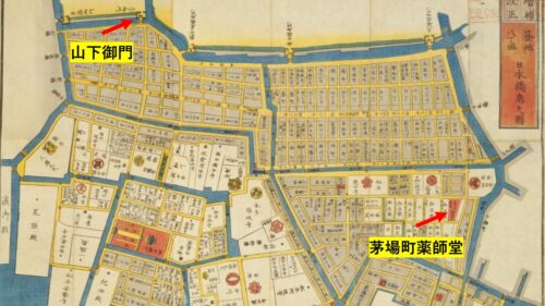 山王祭の祭礼行列は山下御門を出発し、福岡藩黒田家(現外務省)や彦根藩井伊家(現憲政記念館)付近を通り、半蔵門から江戸城内へ…その後、日本橋界隈を練り歩くと、茅場町の御旅所に入りました。