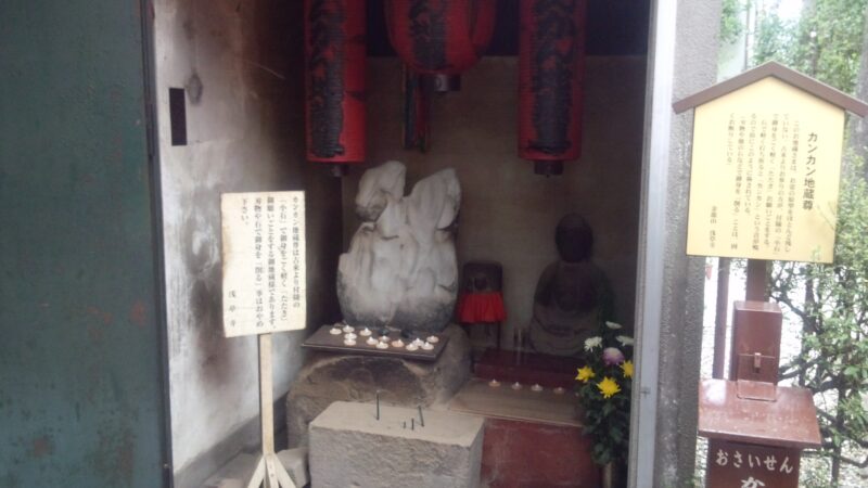 堂内には原型をとどめていない石像が祀られていますが、それが「カンカン地蔵」で、石で打って塩を奉納すると、財福のご利益があると言われます🙂